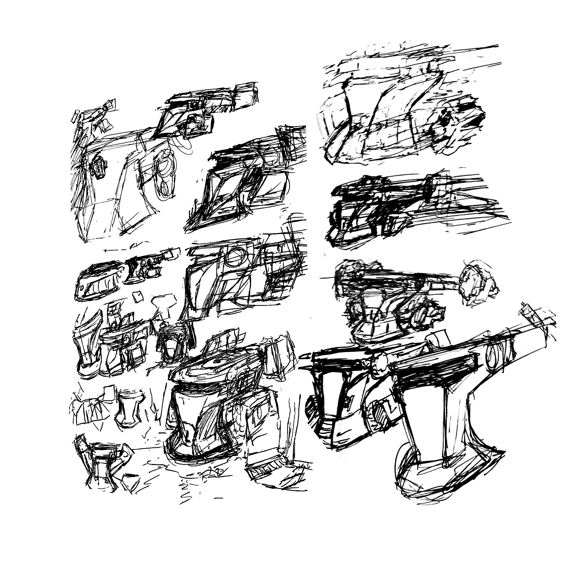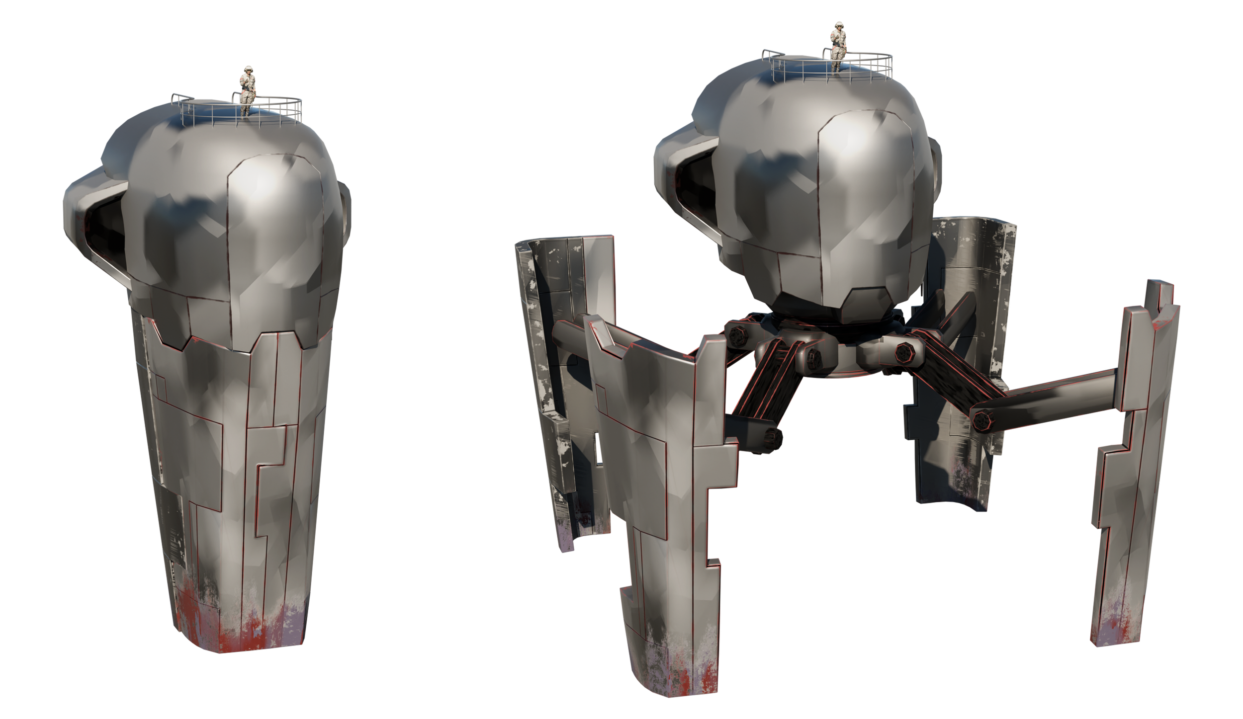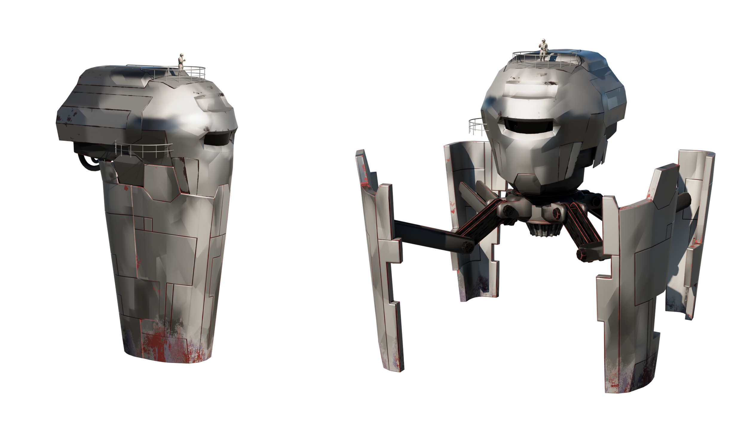 Every great sci-fi character needs a great ship. I’ve been thinking about Lex’s ship since the very beginning. The earliest versions being a sort of space RV. Another early version was a variation of what I’m working on today, a tower-like ship that converts into a quadruped walker when on land. For a while now I’ve imagine these quad-walkers to be the standard mining vessel for Recollectors, miners who extract valuable data from the matterium wastes.