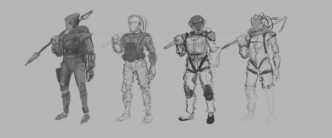 I started off by gathering some references. The most obvious inspirations are miners or construction workers, alongside the usual sci-fi smuggler, bounty hunter, and trooper archetypes. More recently, I’ve been inspired by Death Stranding’s Porters and Marathon’s Runners. I love the amount of gear that they carry. I like the idea of a Recollector having dedicated equipment for scanning, mining, combat, and psychic stability.